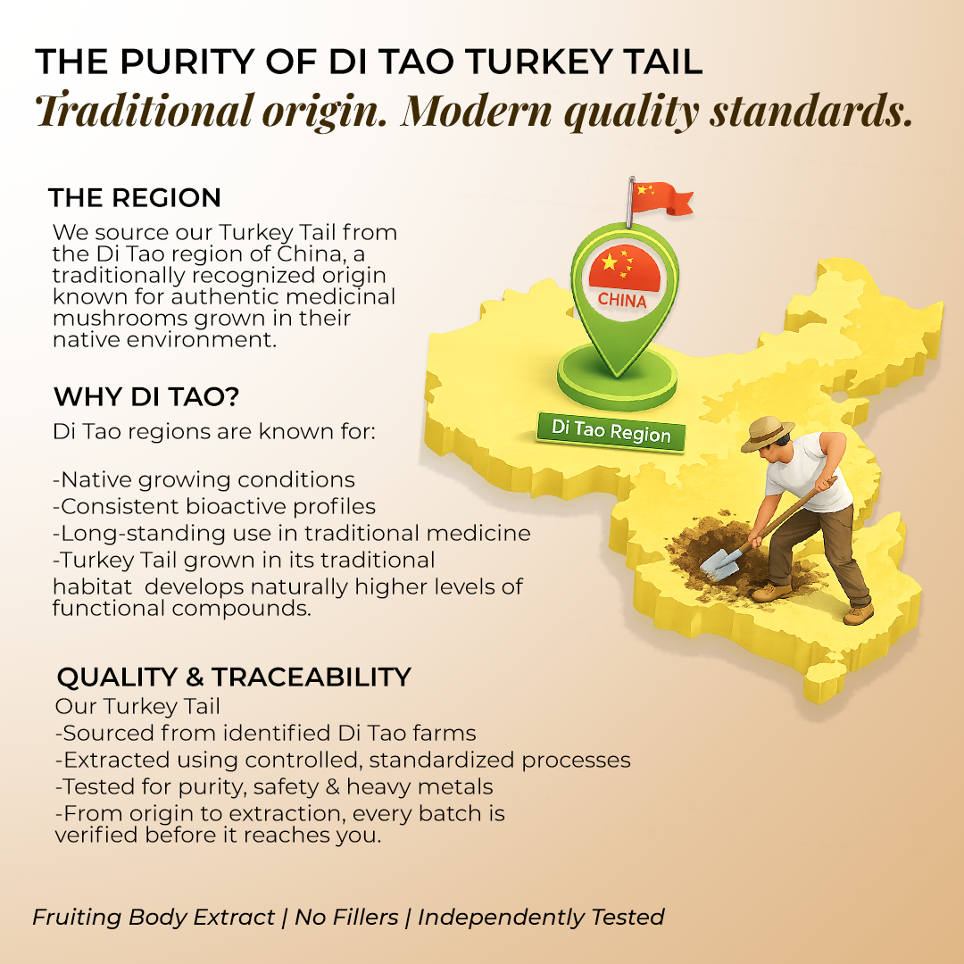 Di Tao Mushrooms: Best in the world sourcing; Authentic, Original & Perfect cultivation to extraction. Assurance of free of GMO, Pesticides, Herbicides & Chemical fertilizers.