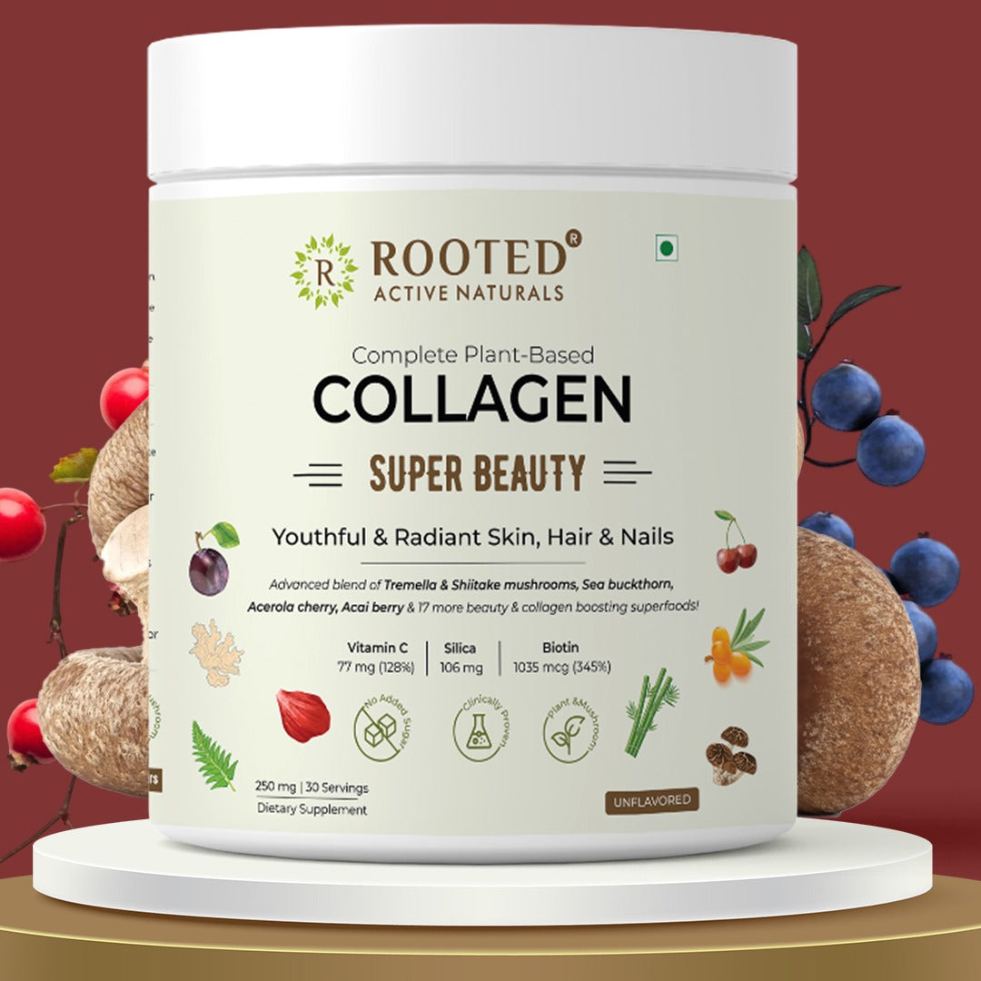Collagen is one of essential proteins in the body which is required for strong bones, healthy skin and hair as well as immunity. But its levels naturally decrease gradually after 30 years of age and this may lead to premature ageing signs like fine lines, wrinkles, and other age related problems. This collagen supplement vegan by Rooted Actives consists of natural collagen derived from plants, Tremella and Shiitake mushrooms, biotin, silica, sea buckthorn, acai berries and 17 other beauty foods which are proven to boost skin and hair health. This vegan collagen is the ideal supplement to consume every day for youthful skin and strong hair and nails. The collagen powder for skin contains an active blend of various superfoods filled with a variety of vitamins, minerals and antioxidants like vitamin C, which brightens the skin, biotin which is necessary for healthy hair growth and other essential ingredients that moisturise and hydrate the skin. The collagen protein powder preserves your muscle mass and also protects the skin from damage by free radicals and environmental stressors