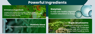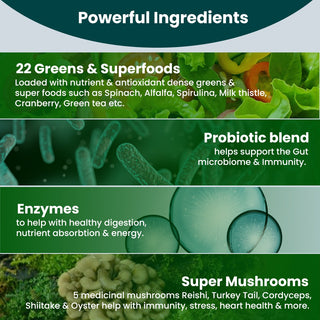 22 Super Greens & Fruits: Spinach, Spirulina, Alfalfa, Barley Grass, Wheatgrass, Chlorella, Apple, Tomato, Green Tea, Blueberry, Cranberry, Pomegranate