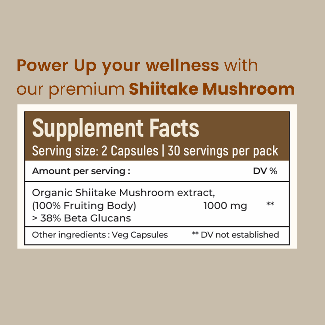 Bursting with nutrition & essential bio compounds Shiitake mushrooms are known to support cardio, skin & hair quality besides boosting Immunity. Convenient, easy-to-use capsules.