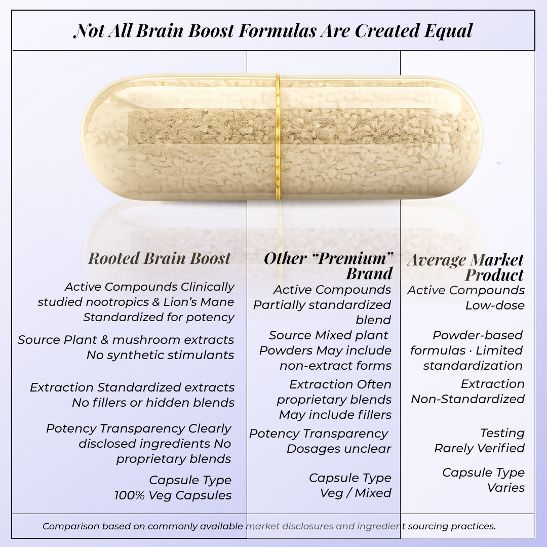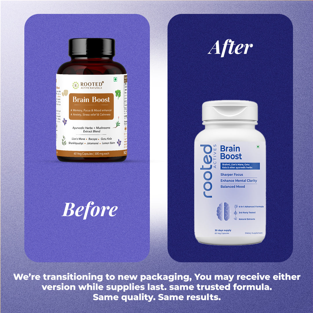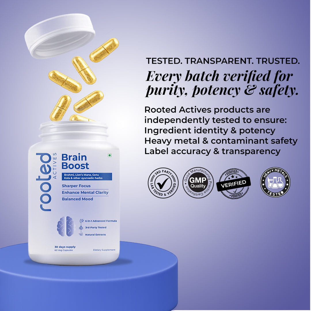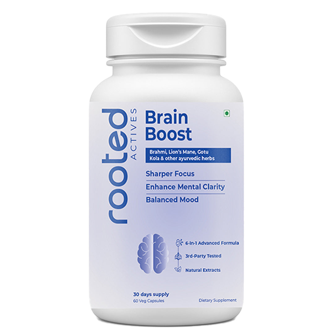Rooted Actives Brain Boost Capsules blend ancient Ayurvedic herbs like Brahmi, Shankpushpi, and Jatamansi with the modern superfood Lion’s Mane Mushroom to help your brain perform at its best.