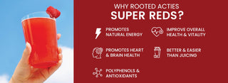 Rooted’s Super Reds tablets are your shortcut to daily fruit nutrition. Packed with 21 antioxidant-rich fruits like grapes, berries, beetroot, pomegranate, and green coffee, each serving supports your heart, boosts energy, and enhances vitality.